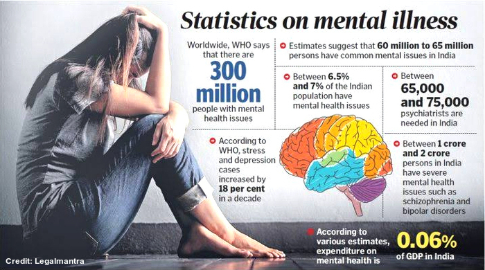 The Government of India has not conducted any study on this particular issue as the Indian State, like the Indian society, is not much worried about issues related to mental health even in the 21st Century. Meanwhile, a 2015-16 survey by Médecins Sans Frontières (MSF) found that nearly 1.8 million adults (45% of the population) in the Kashmir Valley reported symptoms of mental distress, with 41% experiencing symptoms of depression. The data highlights a severe mental health crisis, with 93% of the population having experienced conflict-related trauma.