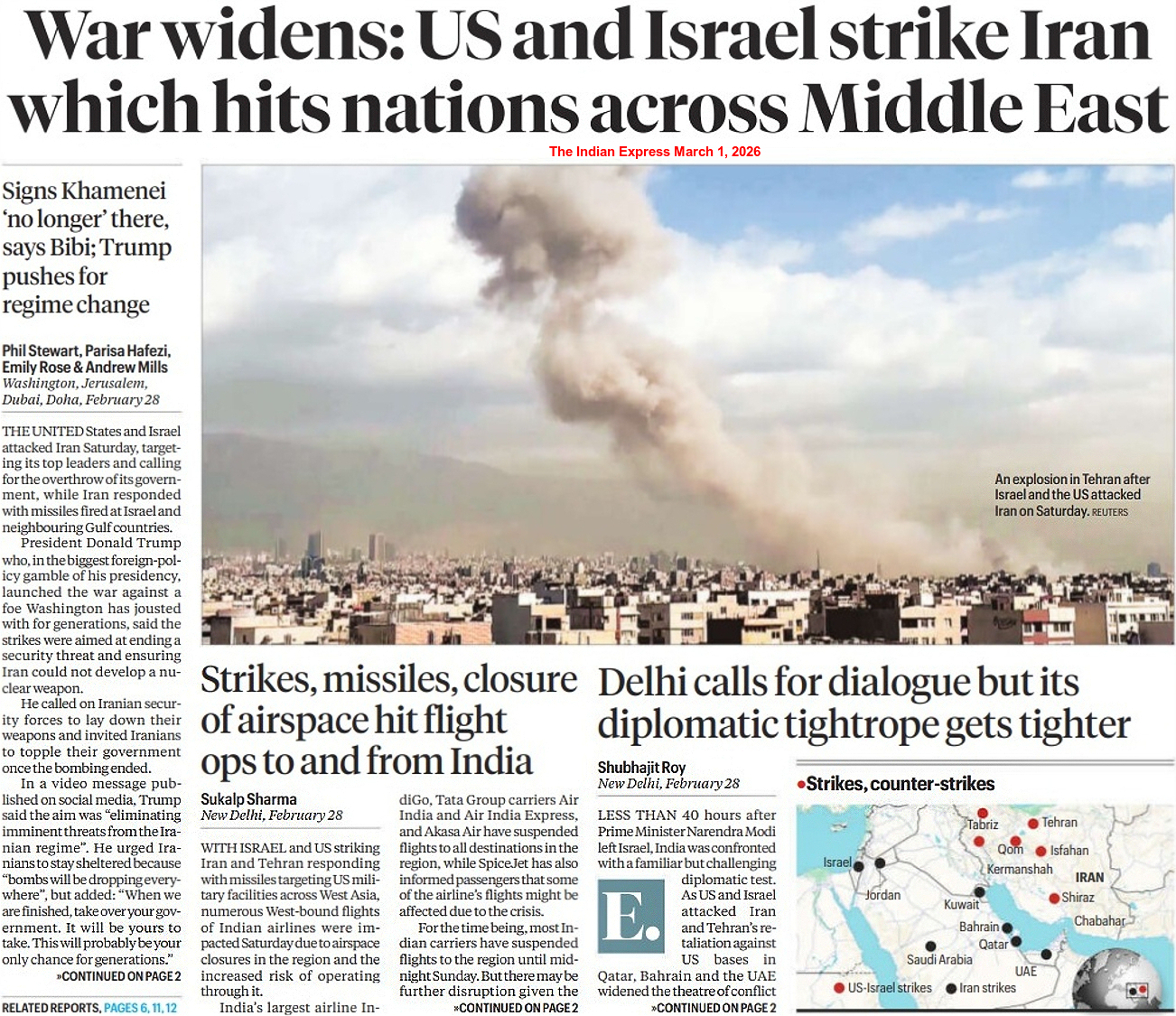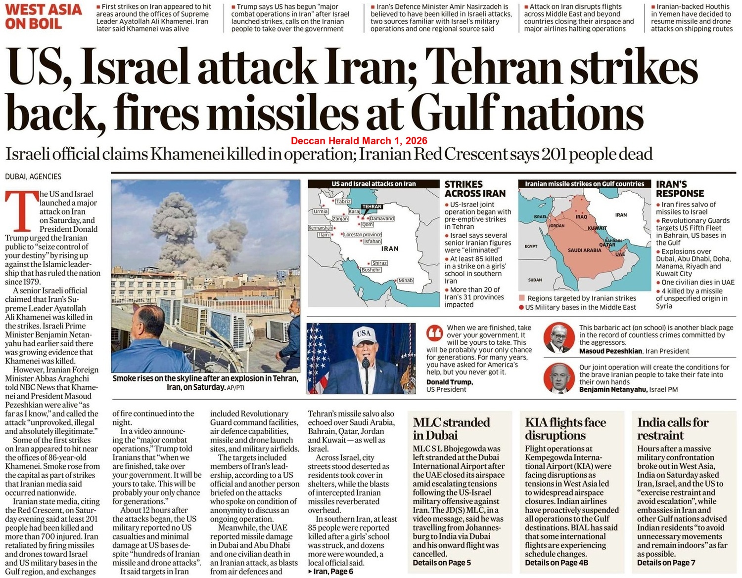 Israel launched a pre-emptive strike on key sites in Iran on February 28 morning, with Prime Minister Netanyahu claiming that the attacks targeted Ayatollah Khamenei and Iranian President Masoud Pezeshkian. The US, too, joined the venture as a series of drones and missiles hit major Iranian cities, including Tehran. Tehran claimed that Israel and the US dropped at least 1,200 bombs on the very first day of the war. On February 28 night, Netanyahu claimed that the Supreme Leader died and his office was completely destroyed.