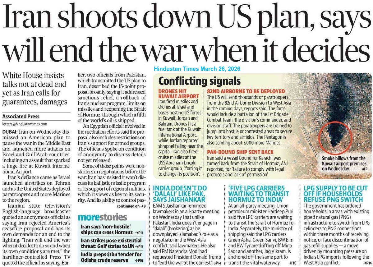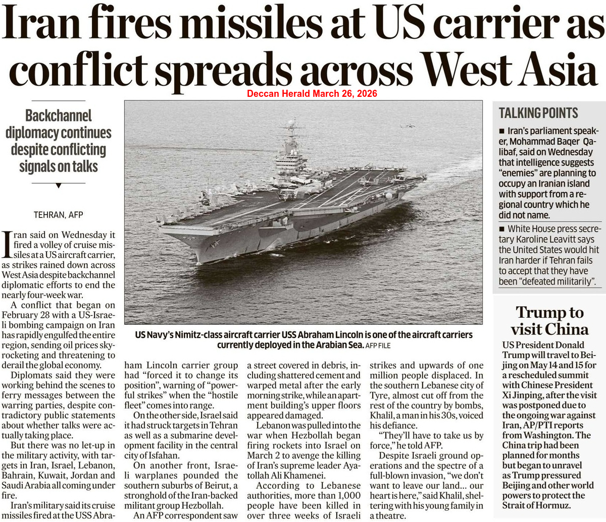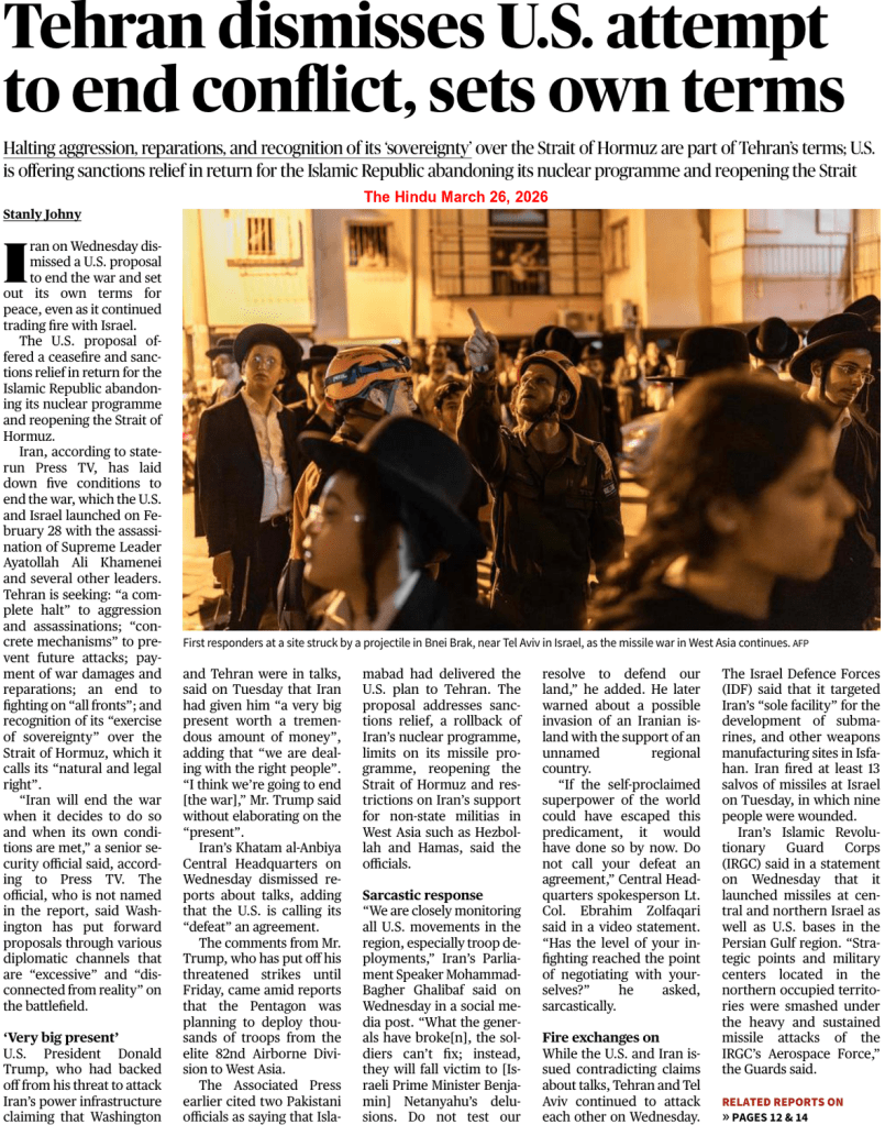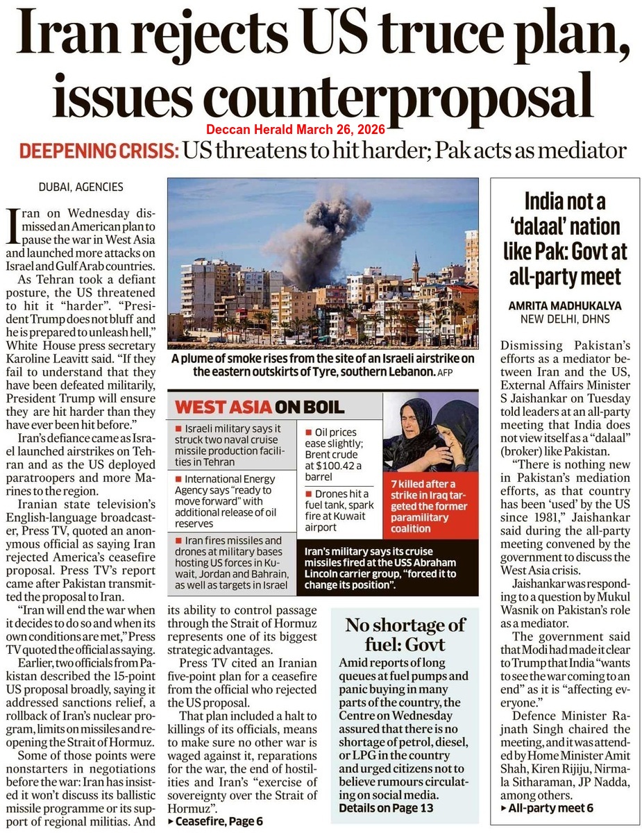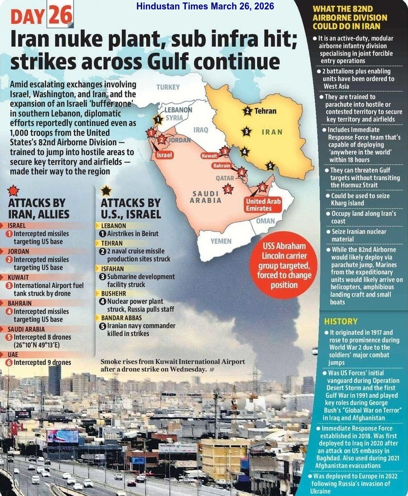 Even as discussions regarding ceasefire and negotiations go on, there is still no respite from attacks and counter-attacks in West Asia. Both Iran and Israel are engaged in direct military confrontations, featuring exchange of airstrikes, drone attacks and missile barrages. On March 25, 2026, Tehran claimed that President Donald John Trump reneged on his promise not to attack power generation facilities, stressing that the US forces targeted a power plant in Isfahan.