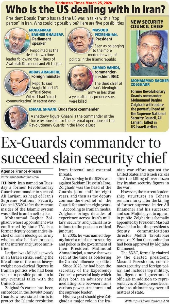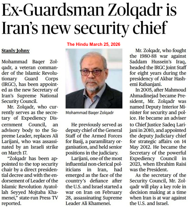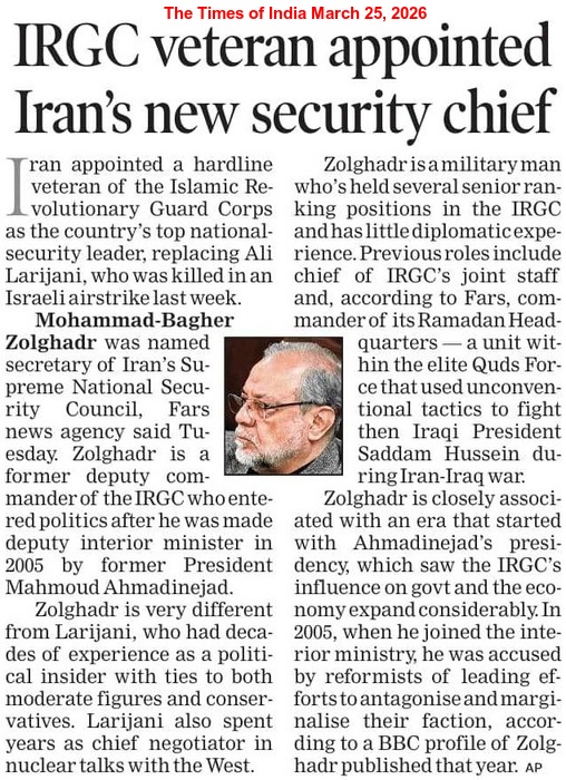 According to political analysts, Larijani was a true insider of the regime who used to maintain close contacts with each and every centre of power. At the same time, his expertise in reaching understandings with foreign countries was also unquestionable. Hence, Zolghadr’s task would be a difficult one. As the influence of the IRGC and the hardliners is growing in Iran (especially after the assassination of Ayatollah Ali Hosseini Khamenei on February 28, 2026), the newly-appointed Secretary of Supreme National Security Council would have to face difficulties in making decisions on various issues.