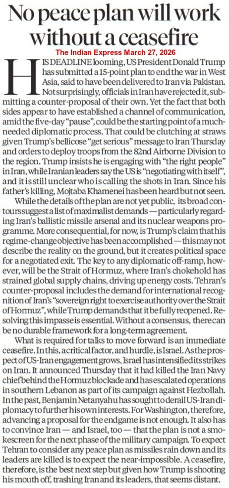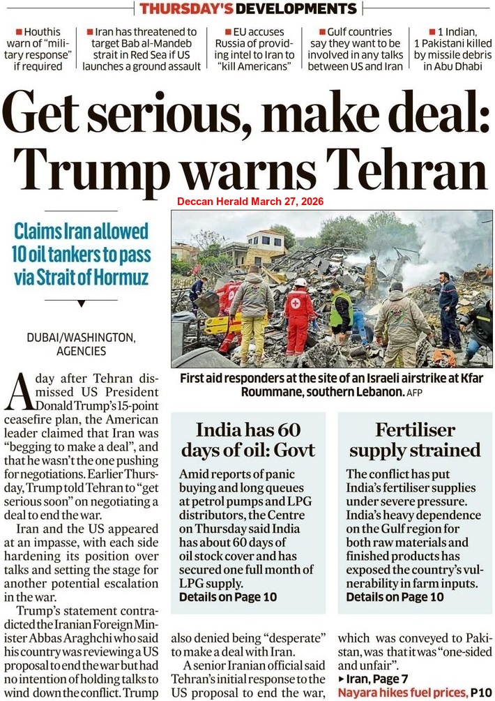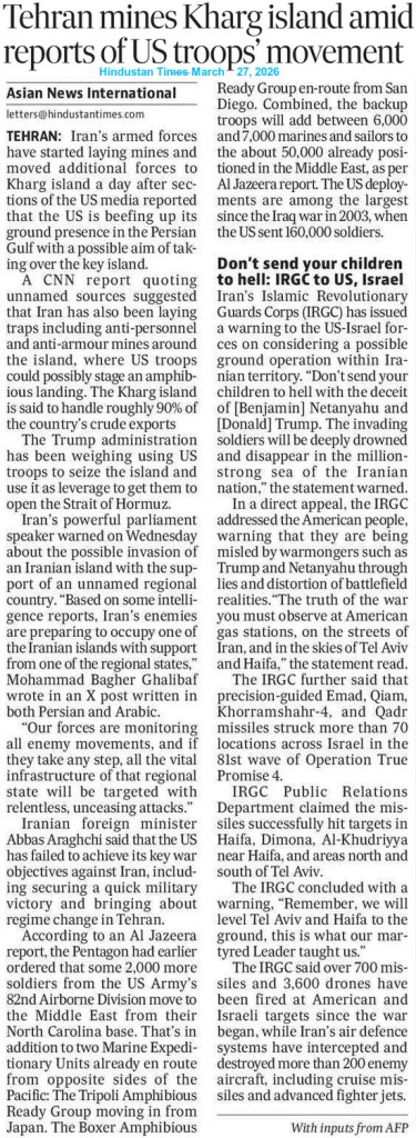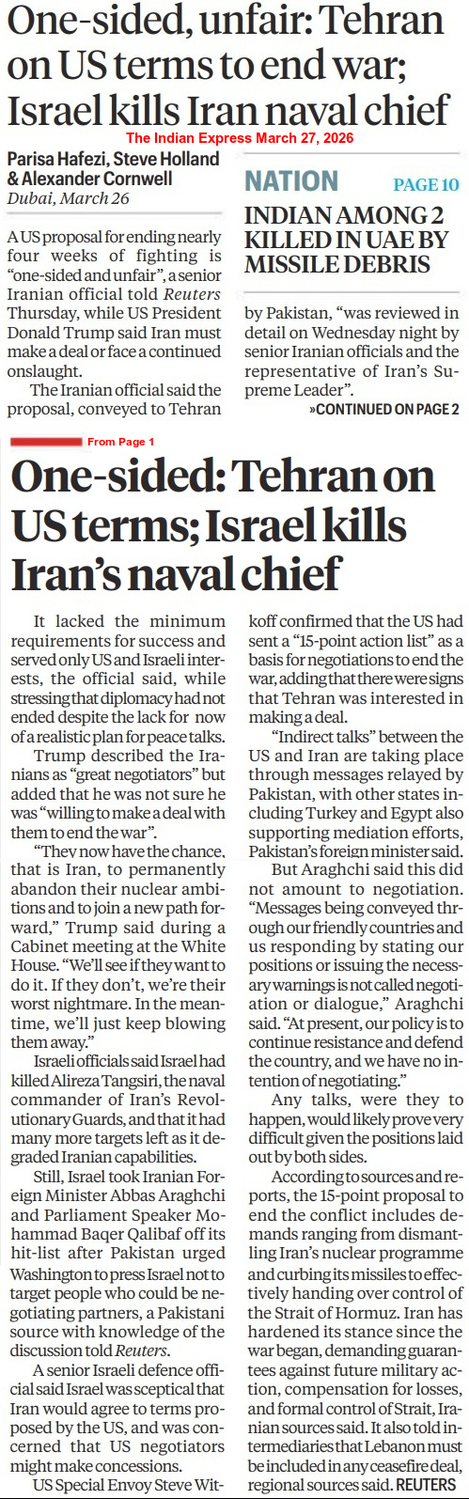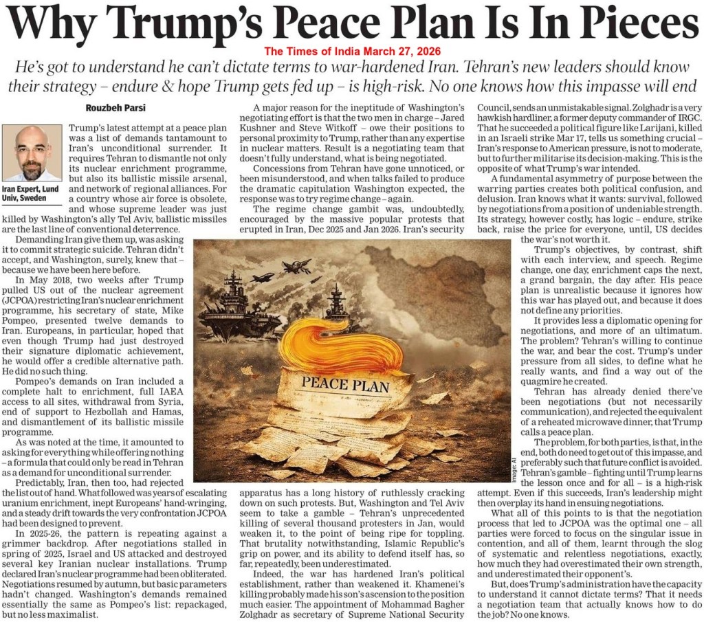 In an exclusive interview with India Today on March 25, senior spokesperson of the Iranian Foreign Ministry Esmail Baghaei stressed that there were no talks or negotiations between Tehran and Washington DC, as “no one can trust US diplomacy“. He recalled that the two countries “were deep in a structured diplomatic process, with technical talks on a possible nuclear agreement scheduled for Vienna, when American strikes hit Iranian soil on February 28, 2026“. According to Baghaei, it was not an isolated incident, as US forces had attacked Iran in June 2025, a couple of days before the beginning of the sixth round of negotiations. “This was a betrayal of diplomacy,” he stated, claiming that the phrase recently entered the common lexicon in Iran. According to Baghaei, the Iranian Armed Forces are currently focussed on defending their national territory and sovereignty.