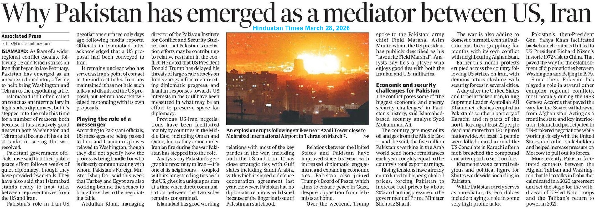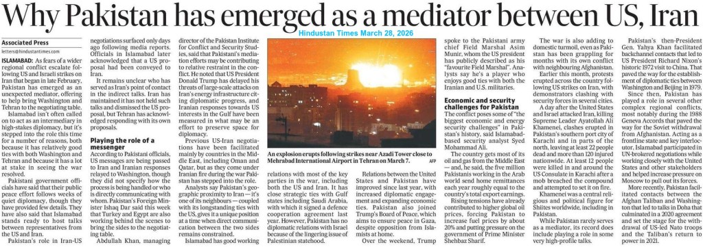 Political analysts believe that there is a combination of strategic self-interests, such as the need to project itself as global power and the desire to prevent instability from spreading across its own borders. Pakistan is grappling with a broken economy and relies heavily on the Middle East for fuel imports (approximately 40% of its oil needs) and remittances, which are crucial for its financial stability. A prolonged conflict in the Strait of Hormuz directly impacts its fuel prices and exacerbates fiscal pressures, making a mediated peace crucial for Pakistan’s own stability. As a neighbour sharing a 1,000km border with Iran, Pakistan is also highly vulnerable to the fallout from a war as escalation could lead to security issues on its western frontier, adding to its ongoing, intense clashes with Afghanistan-based militants.