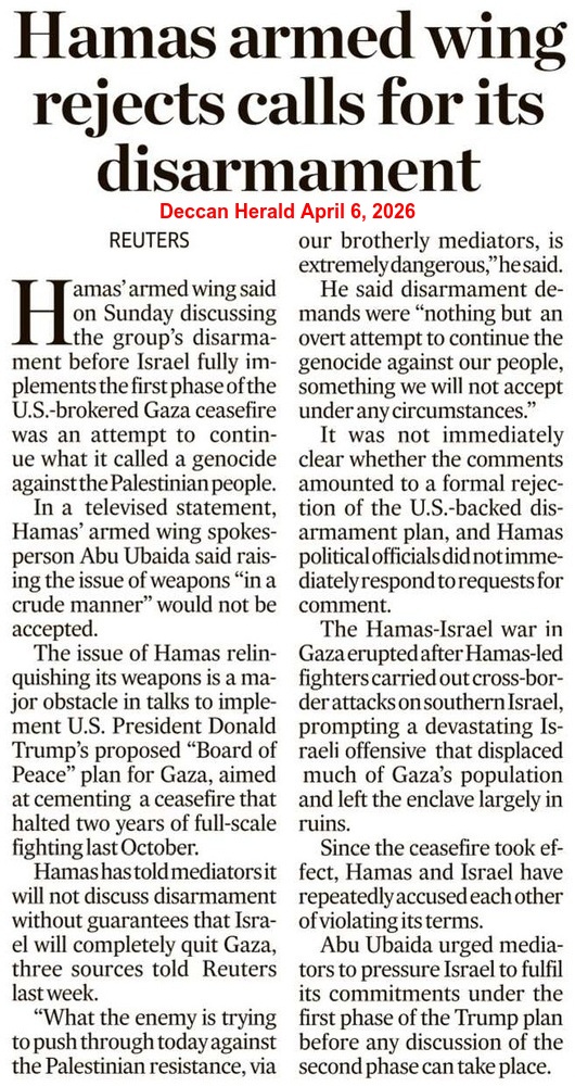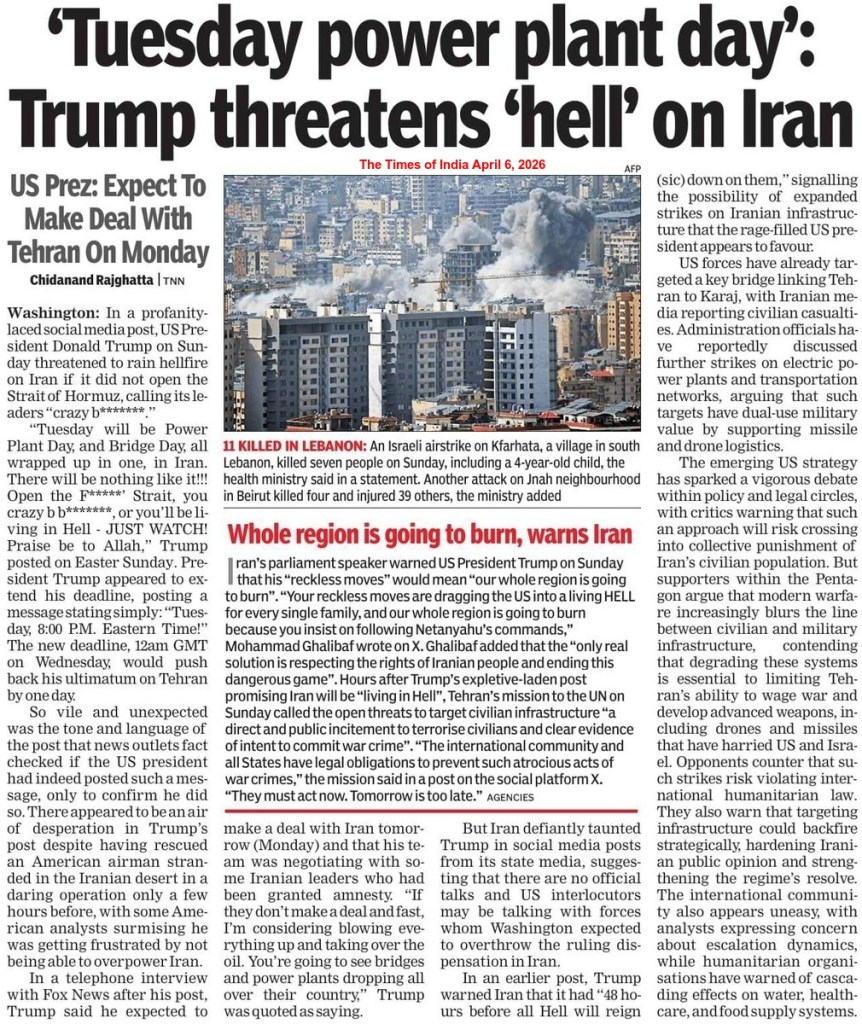 Meanwhile, back in the land of the clueless, President Trump was forced to respond because of the growing pressure – both internally and from around the world – against his illegal and disastrous war in Iran. In an extremely defensive April 1, 2026 address to the nation, the President said that the US was “on track to complete all of America’s military objectives shortly“, claiming that Iran “has been eviscerated and essentially is really no longer a threat“. Cynically, he stressed that this war of aggression was “necessary for the safety of America and the security of the free world“, making sure to say the words “nuclear weapon” repeatedly in order to induce fear among the gullible. While still no clear objective exists, the closest thing was Trump’s statement that: “We’re going to hit them extremely hard over the next two to three weeks. We’re going to bring them back to the stone ages where they belong. In the meantime, discussions are ongoing… Yet, if during this period of time no deal is made, we have our eyes on key targets. If there is no deal, we are going to hit each and every one of their electric generating plants very hard and probably simultaneously.“