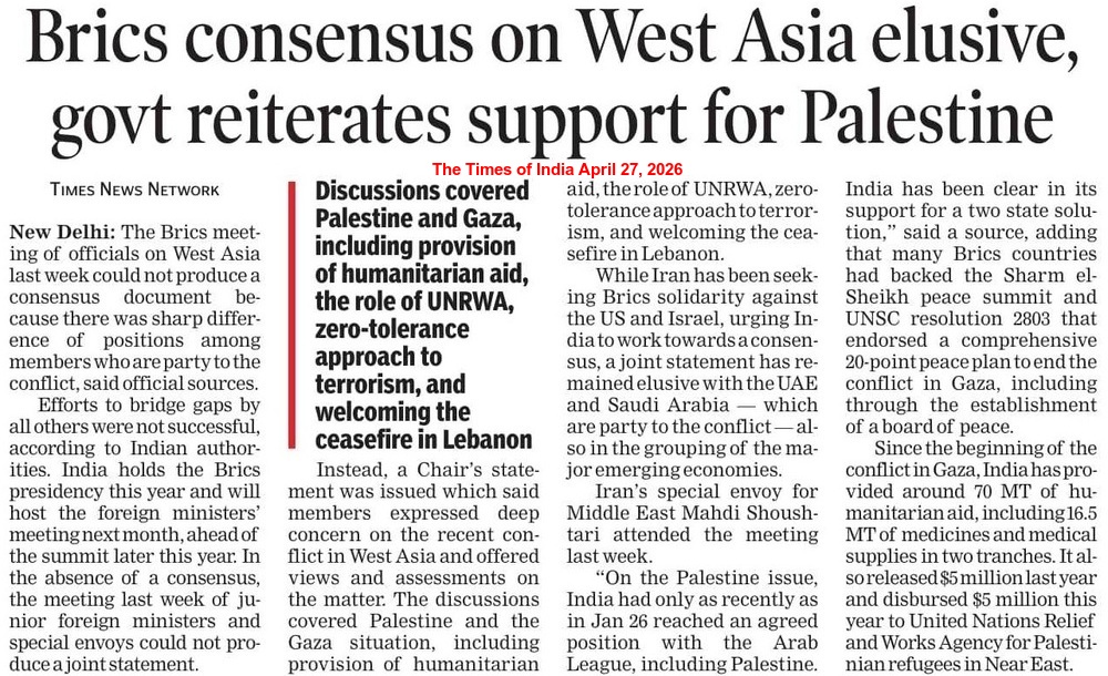 It may be noted that Gaza has been primarily under the control of the Palestinian Hamas Movement since June 2007, when the armed group forcibly took control of the Strip from the Fatah-led Palestinian Authority. Following the Israel-Hamas War that ended with the October 2025 ceasefire, a National Committee for the Administration of Gaza is trying hard to take over governance as Hamas disarms. This transition is part of a plan involving an international stabilisation force, the phased withdrawal of Israeli troops and the reconstruction of the Gaza Strip, endorsed by international actors.