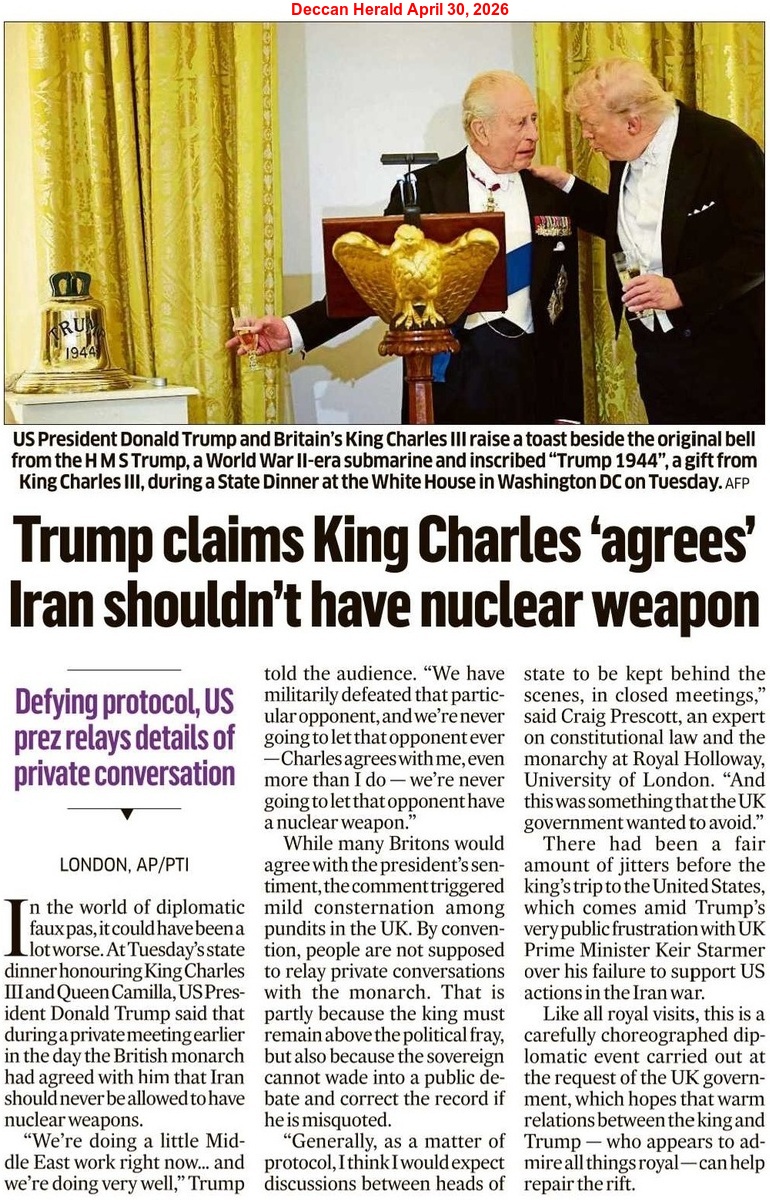 International Peace Coalition; April 30, 2026: Americans of conscience may be casting around for a phrase or even a word that captures the repulsive spectacle this week of King Charles III of the UK and Queen Camilla Parker Bowles being wined, dined and treated almost like the founding fathers of the US by President Donald John Trump, a Joint Session of Congress and almost the entirety of the fawning Establishment media.