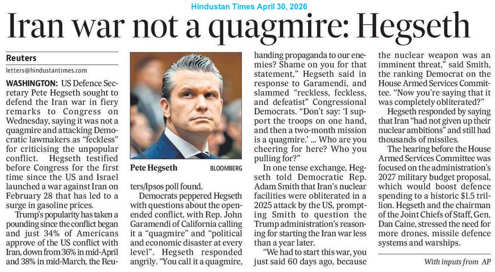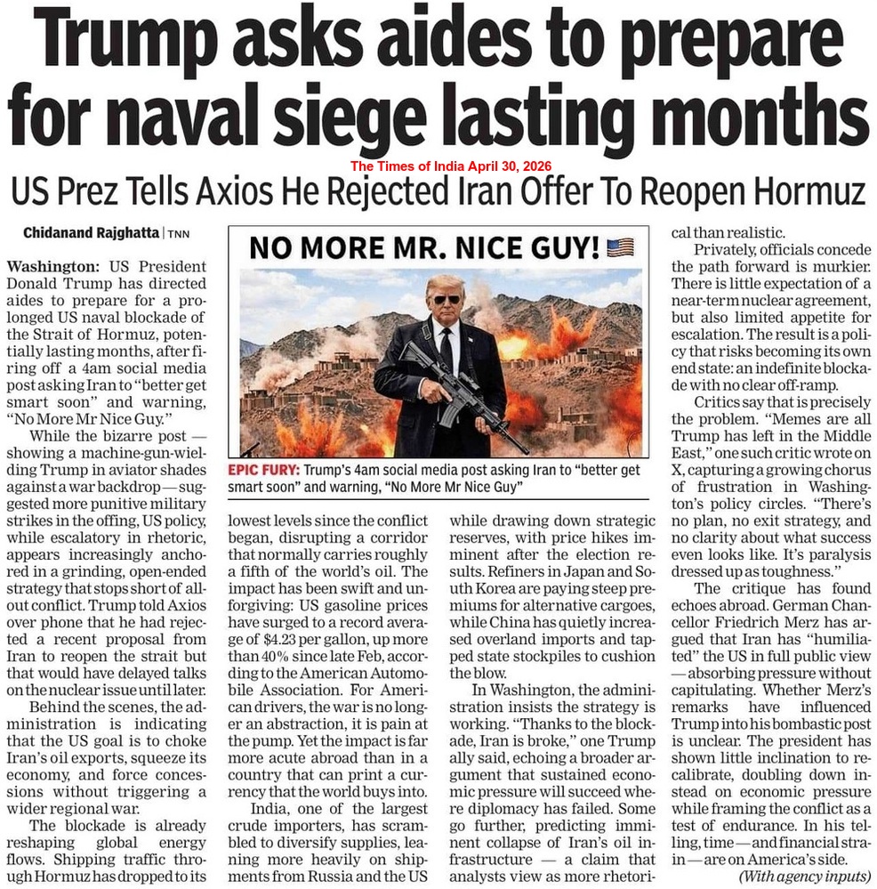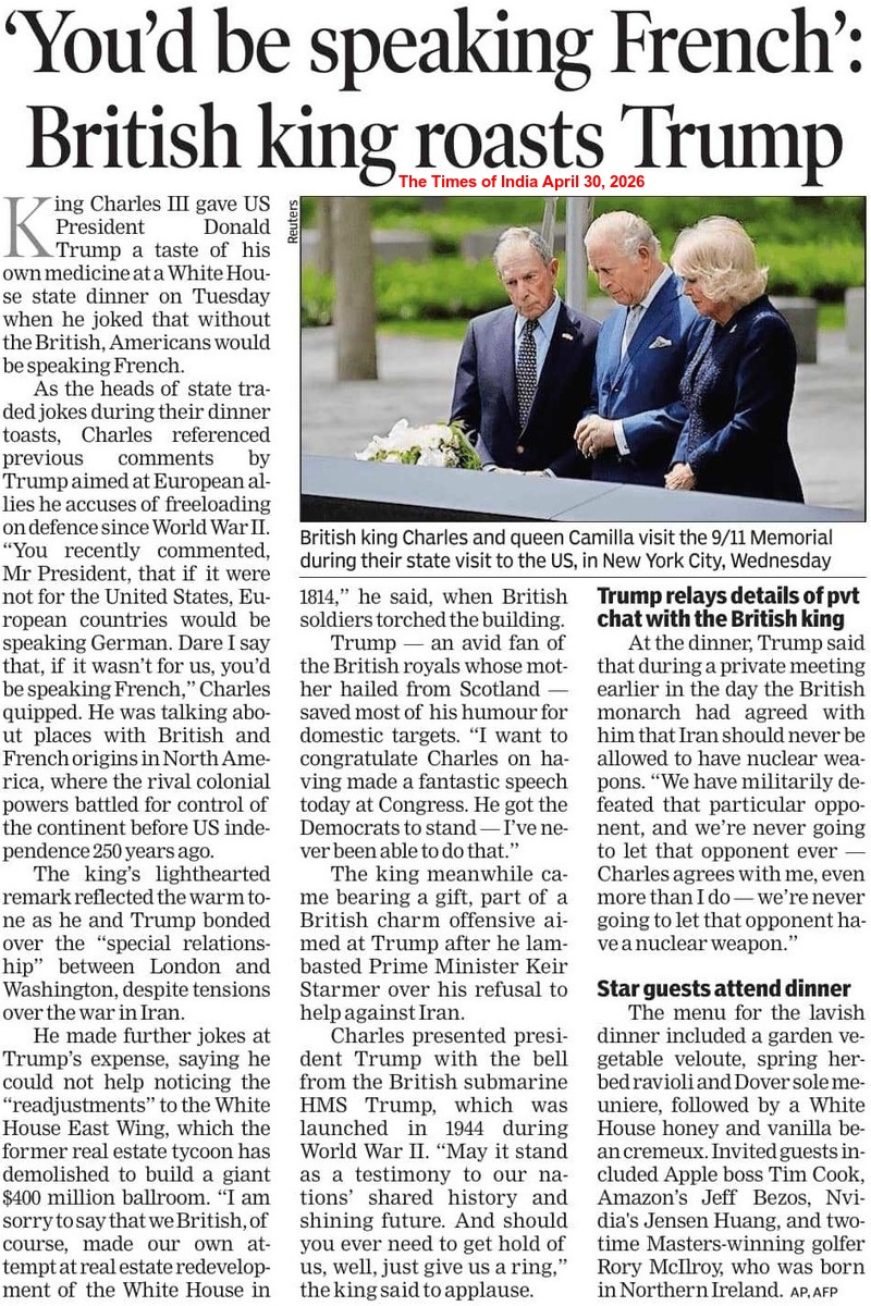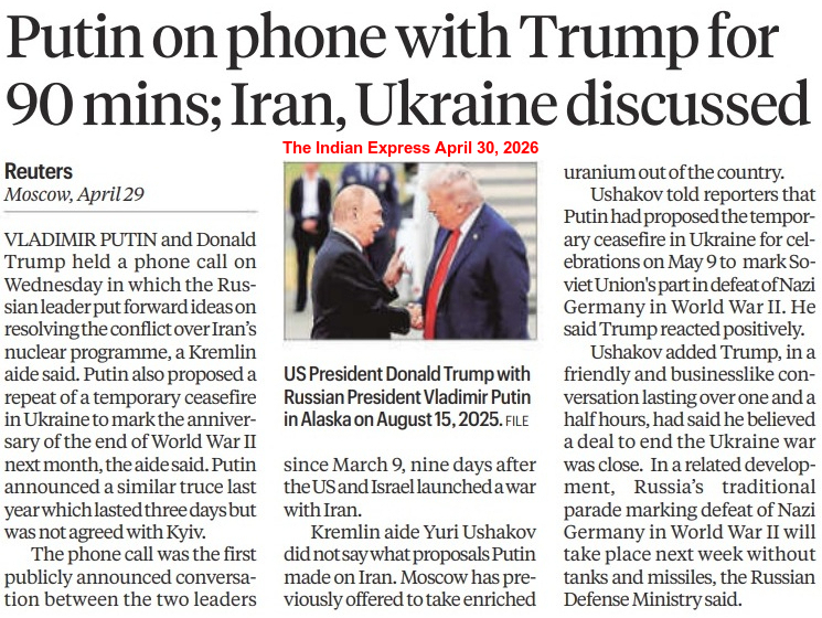 The second thing which pierced the bubble of unreality surrounding the King’s visit was a well-timed phone call that Russian President Vladimir Vladimirovich Putin made to President Trump on April 29, 2026, right in the middle of the King’s triumphal tour of the US. Putin’s “friendly, frank and businesslike” call lasted an hour and a half, and during the call, the Russian President made specific proposals to his US counterpart for concrete steps to help solve both the Iran War and the Ukraine War. It was a dose of reality from a statesman who is still searching for a way to pull President Trump – and the United States – back from the brink, and stop him from jumping off the cliff holding hands with King Charles III.